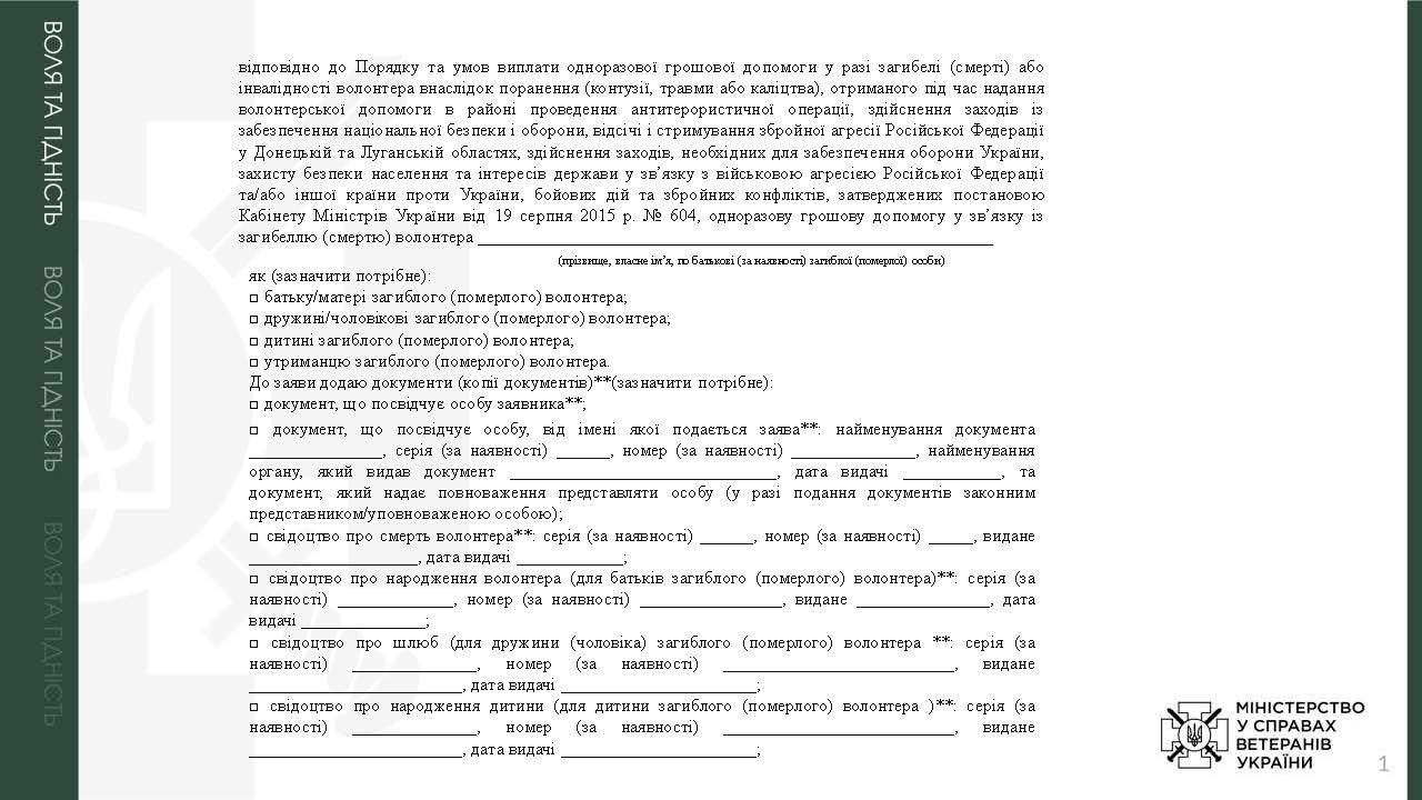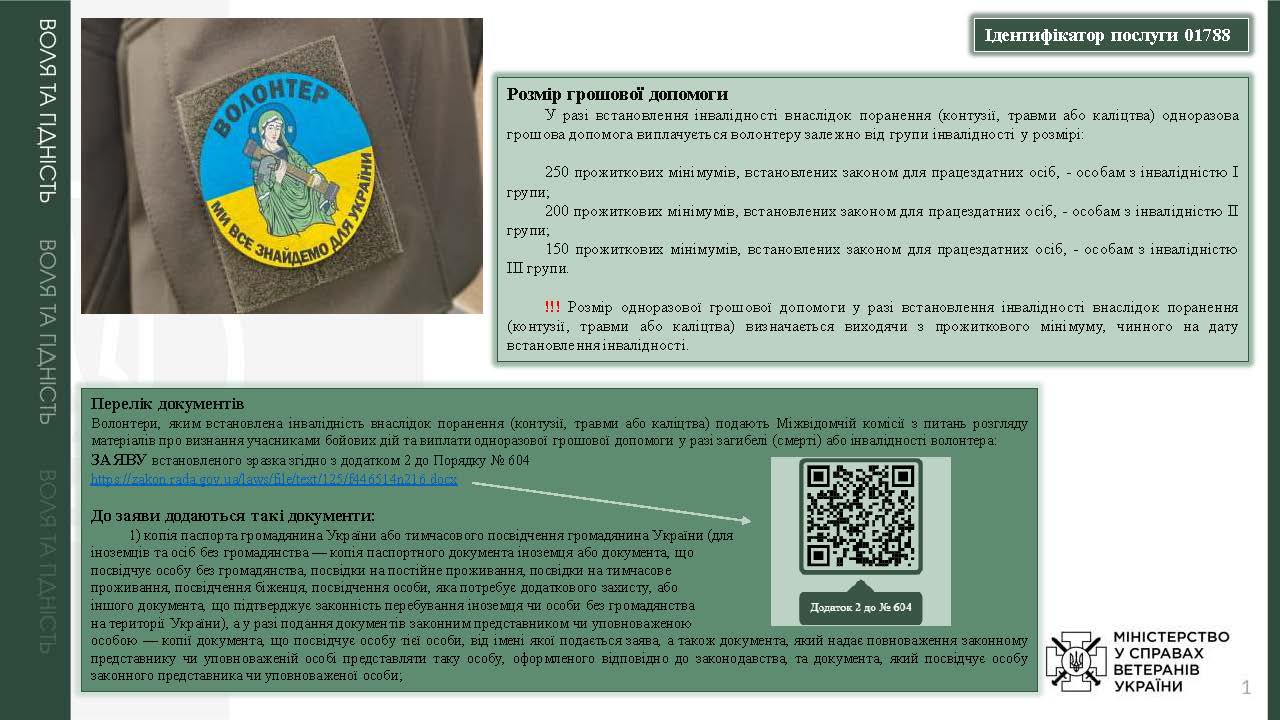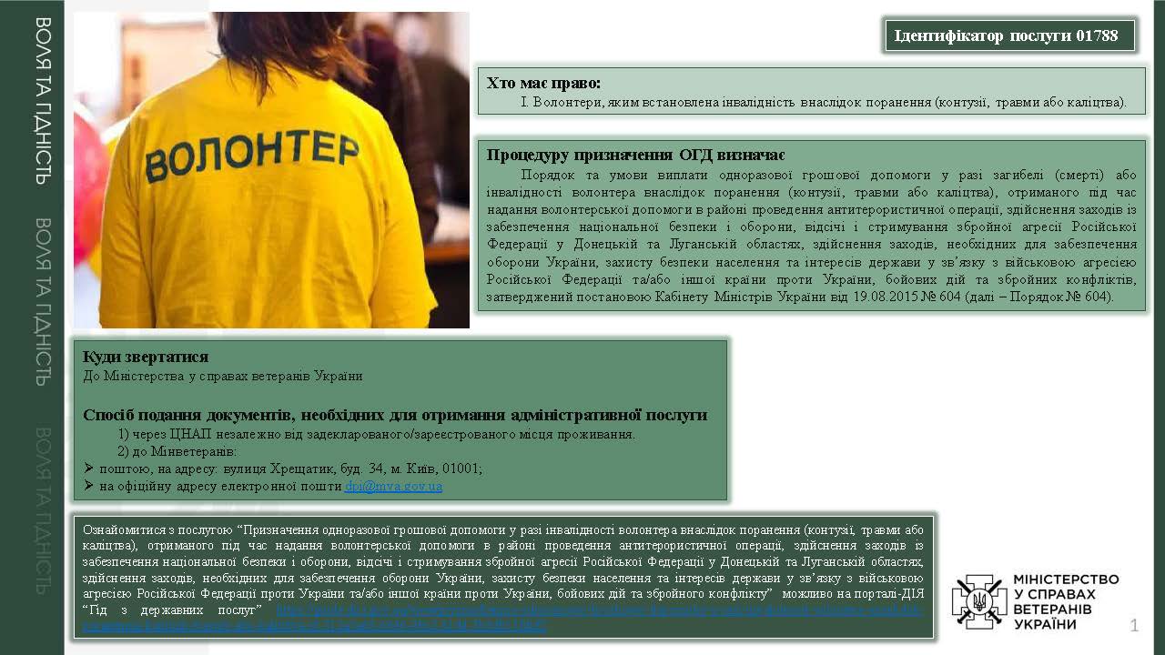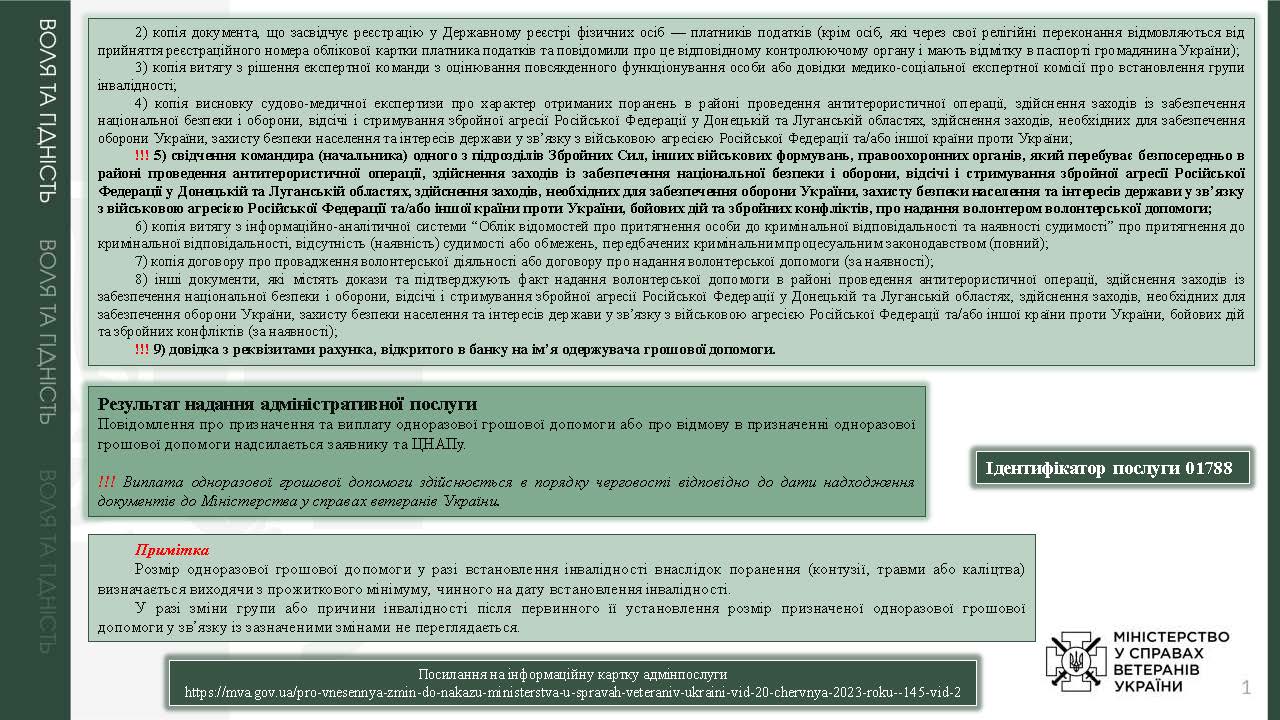 Призначення одноразової грошової допомоги у разі інвалідності волонтера внаслідок поранення (контузії, травми або каліцтва), отриманого під час надання волонтерської допомоги в районі проведення антитерористичної операції, здійснення заходів із забезпечення національної безпеки і оборони, відсічі і стримування збройної агресії Російської Федерації у Донецькій та Луганській областях, здійснення заходів, необхідних для забезпечення оборони України, захисту безпеки населення та інтересів держави у зв’язку з військовою агресією Російської Федерації проти України та/або іншої країни проти України, бойових дій та збройного конфлікту У разі встановлення інвалідності