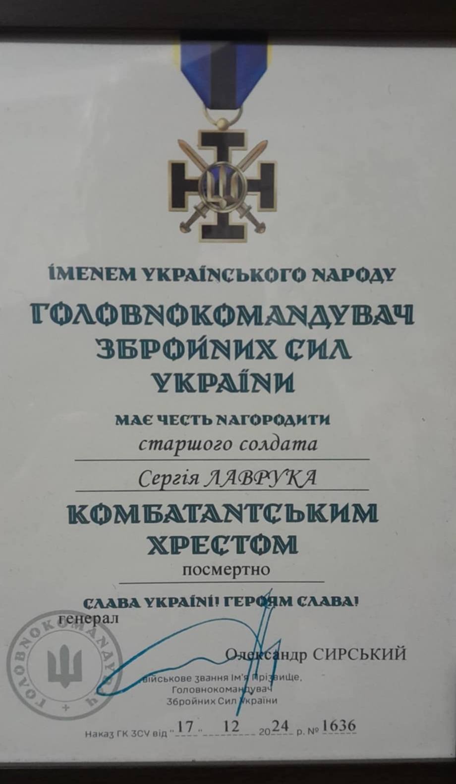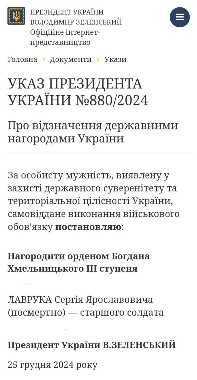 Воїна з Княждвора Сергія ЛАВРУКА нагороджено орденом «За мужність» ІІІ ступеня (посмертно)
